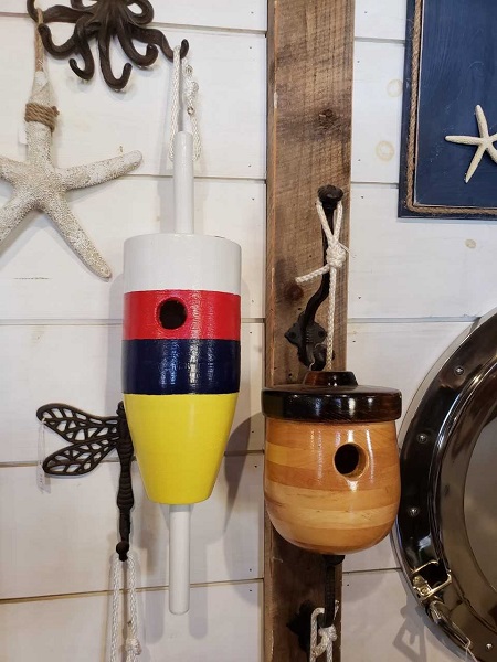 Colorful, turned-wood birdhouses hang in one corner of the shop, made be Gemme’s uncle, and are a wonderful gift idea for the birders in your life. The craftsmanship alone is amazing. She also carries Buoy Bells from Maine, which are wind chimes that replicate the distinctive sound of ocean buoys.