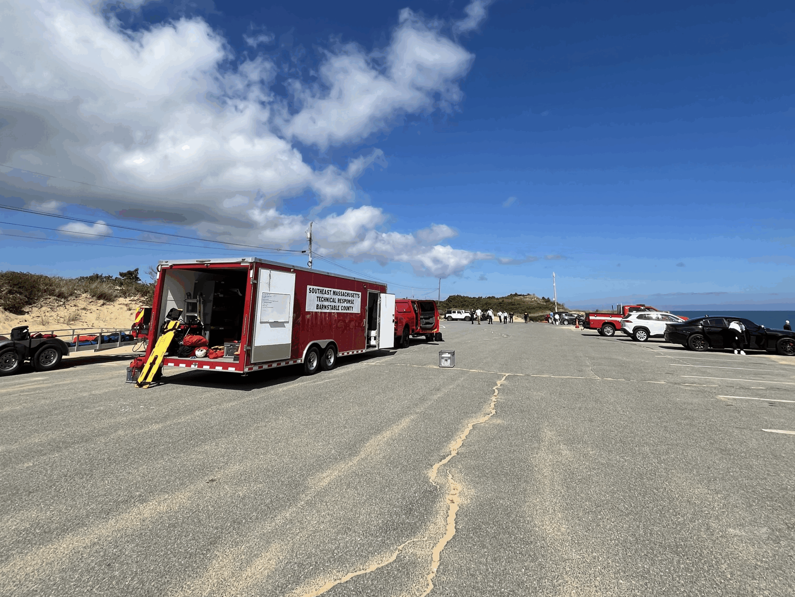 WELLFLEET – From Wellfleet Fire: The Barnstable County Tech Rescue Team was training at Whitecrest Beach on Thursday. They use this beach to practice high-angle rescues. The Team responds to calls throughout the Cape and is comprised of members from various Cape Fire Departments. Wellfleet Fire has two members on this Team, Captain Justin Kinshaw and Firefighter Demi Miskiv.