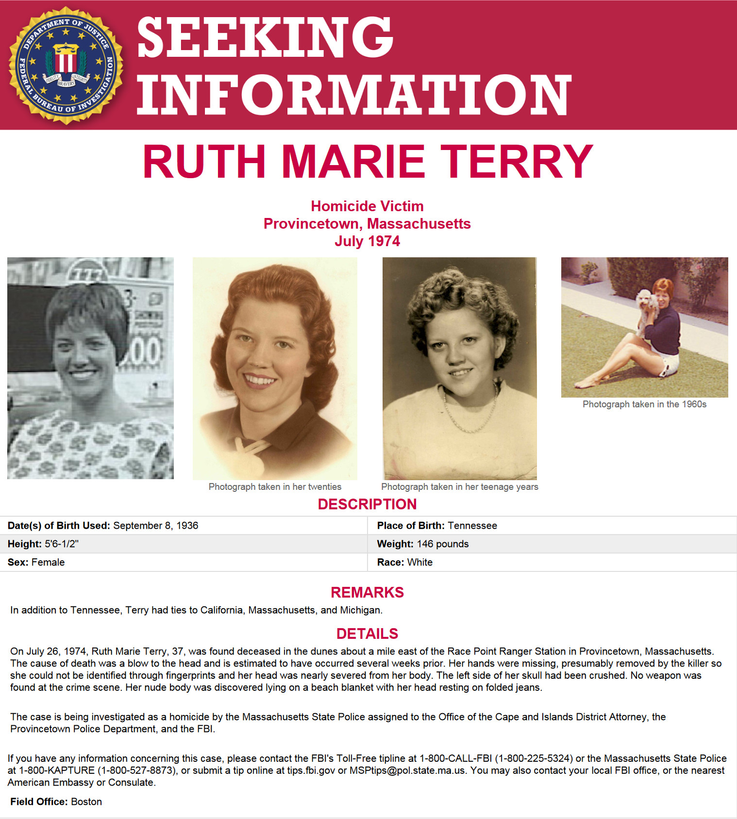 Background: The Boston Division of the Federal Bureau of Investigation (FBI), the Massachusetts State Police assigned to the Office of the Cape and Islands District Attorney Michael O’Keefe, the Provincetown Police Department, and the U.S. Attorney’s Office for the District of Massachusetts, are announcing that after nearly a half-century, the oldest, unidentified homicide victim in Massachusetts, dubbed the “Lady of the Dunes,” has been identified as Ruth Marie Terry of Tennessee.