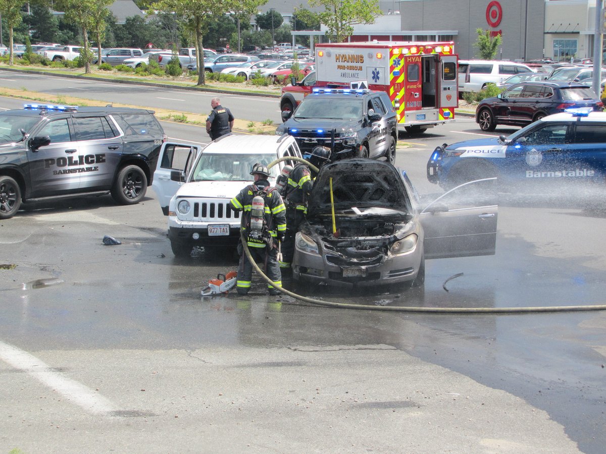 HYANNIS – A fiery crash on Iyannough Road (Route 132) by the Cape Cod Mall shut down that section of Route 132 sometime around 2 PM Sunday. Everyone made it out of the burning vehicle safely. At least two people were evaluated for injuries. Route 132 was closed between Enterprise Road and the Airport Rotary. Our reporter on the scene tells us the traffic light at that intersection which had been reported not working earlier was still out. Barnstable Police are investigating the exact cause of the crash. Route 132 reopened about 2:45 PM but motorists were urged to use caution while repairs continue to the traffic light by the mall. Remember intersections with non-working traffic lights should be treated as four-way stops.