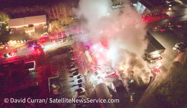 From Bourne Fire: At approximately 6:30 PM, crews were dispatched for a central station alarm at the location. Upon arrival, the shift commander observed smoke showing and requested a working fire assignment, bringing additional Bourne Fire resources, mutual aid, and initiating a full department recall. Due to the size of the building and the scope of the fire, a second alarm was requested. Given the nature of the business and materials associated with woodworking operations, the State District 1 Hazardous Materials Response Team was requested to monitor air quality. Readings showed elevated carbon monoxide levels inand around the fireground, with no additional hazardous conditions detected.