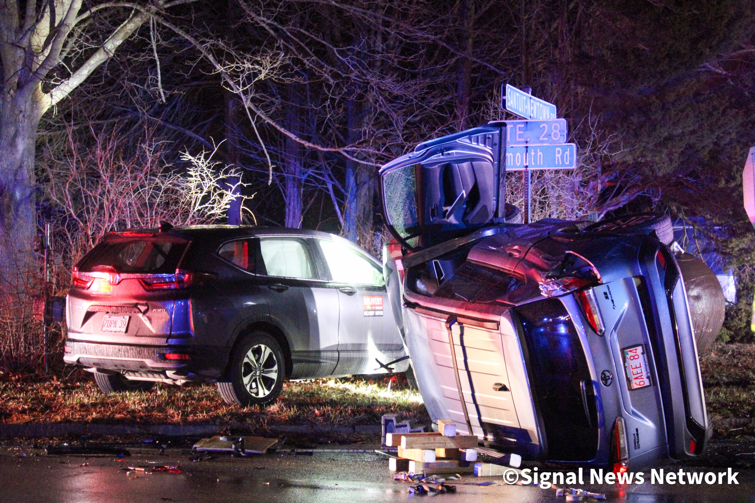 COTUIT – A two vehicle crash left one car on its side in Cotuit. Firefighters had to extricate some of the victims after the collision on Falmouth Road (Route 28) at Santuit-Newtown Road sometime after 8:30 PM Friday. Several ambulances were called to the scene. Route 28 was completely closed in the area.