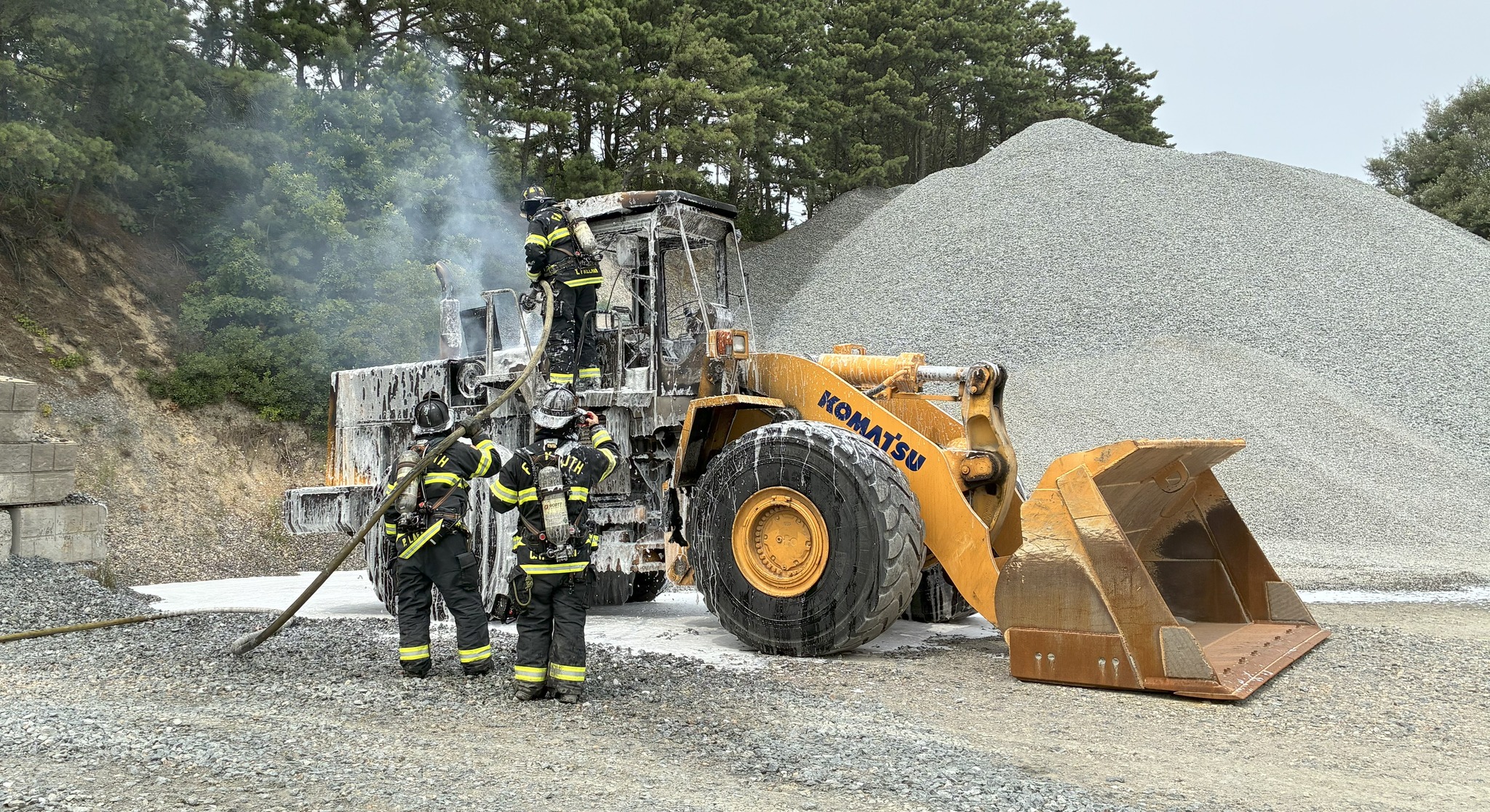 From Falmouth Fire-Rescue: Wednesday at 1:30 PM, an employee at Cape Cod Aggregates on Thomas B. Landers Road called reporting a vehicle fire. Upon arrival, Engine 20 reports a fire in a front-end loader, which was about 80% involved in the fire.