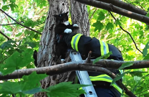 HARWICH – On Wednesday about 6:30 PM, Aggie the house cat got out and shimmied up a tree. The call went out to the fire department can you help please? Firefighters Andrew Ottino and Steve Imparato along with Captain Leighanne Smith arrived on scene just off Route 28 and saved the day. F/F Imparato climbed the ladder twenty feet up and grabbed Aggie who jumped out his arm halfway down the ladder and headed back into the house. Everyone was safe and sound.
