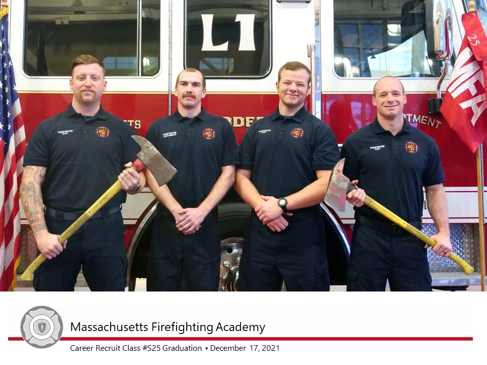 Class #S25 (Springfield): 23 Graduates from 10 Fire Departments include Firefighters Anthony DePrizo, Nathan Deroochers, Abijah Herrin, and Brad Tolbert of the Falmouth Fire Department: