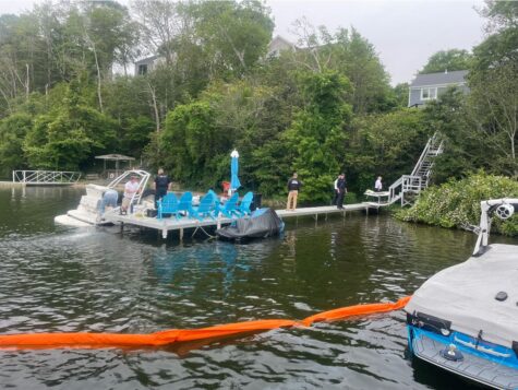 MASHPEE – Officials in Mashpee responded to a reported sinking vessel shortly after 9 AM Tuesday on Mashpee Pond off Birch Way. Crews used pumps to dewater the vessel. Booms were deployed to contain a possible fuel leak from the vessel. No injuries were reported.