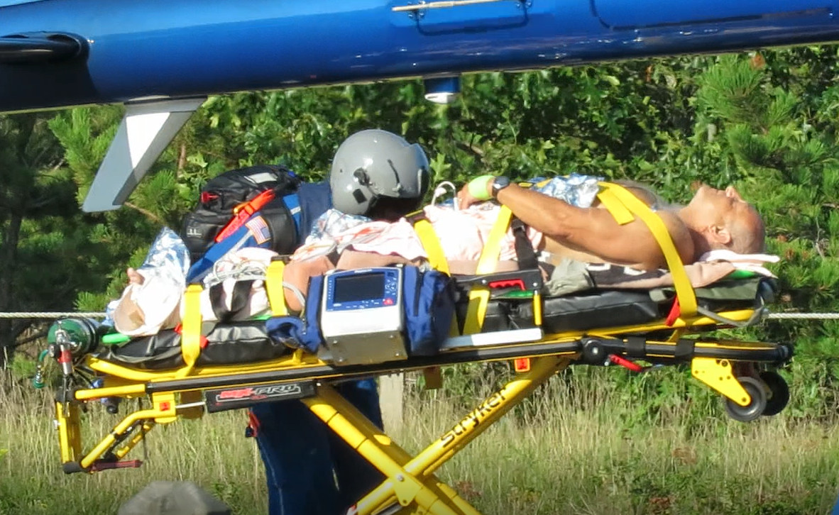 A man bitten by a shark is loaded onto a MedFlight helicopter.