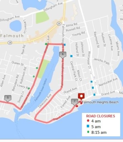 Several streets in Falmouth Heights (see map herein) will close at 5 am and stay closed long enough for runners to clear the finish line, and for crews to properly clean up the area. Limited access to Falmouth Heights residences may be granted until the race starts–proof of residency will be required.