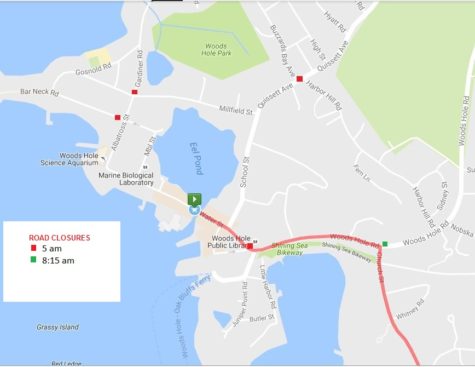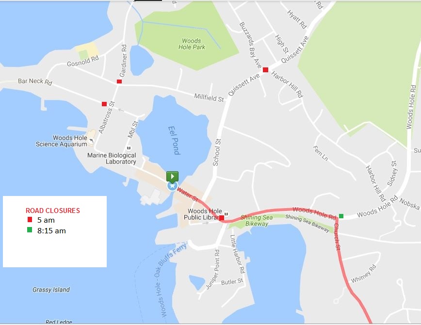 Water Street, School Street, Albatross Street, MBL Street, North Street, Millfield Street, and Quissett Avenue (between Millfield Street and Harbor Hill Road) will be closed to vehicle traffic at 5:00 am until about 10 am – no access.