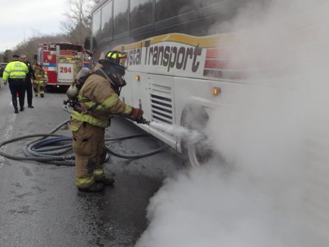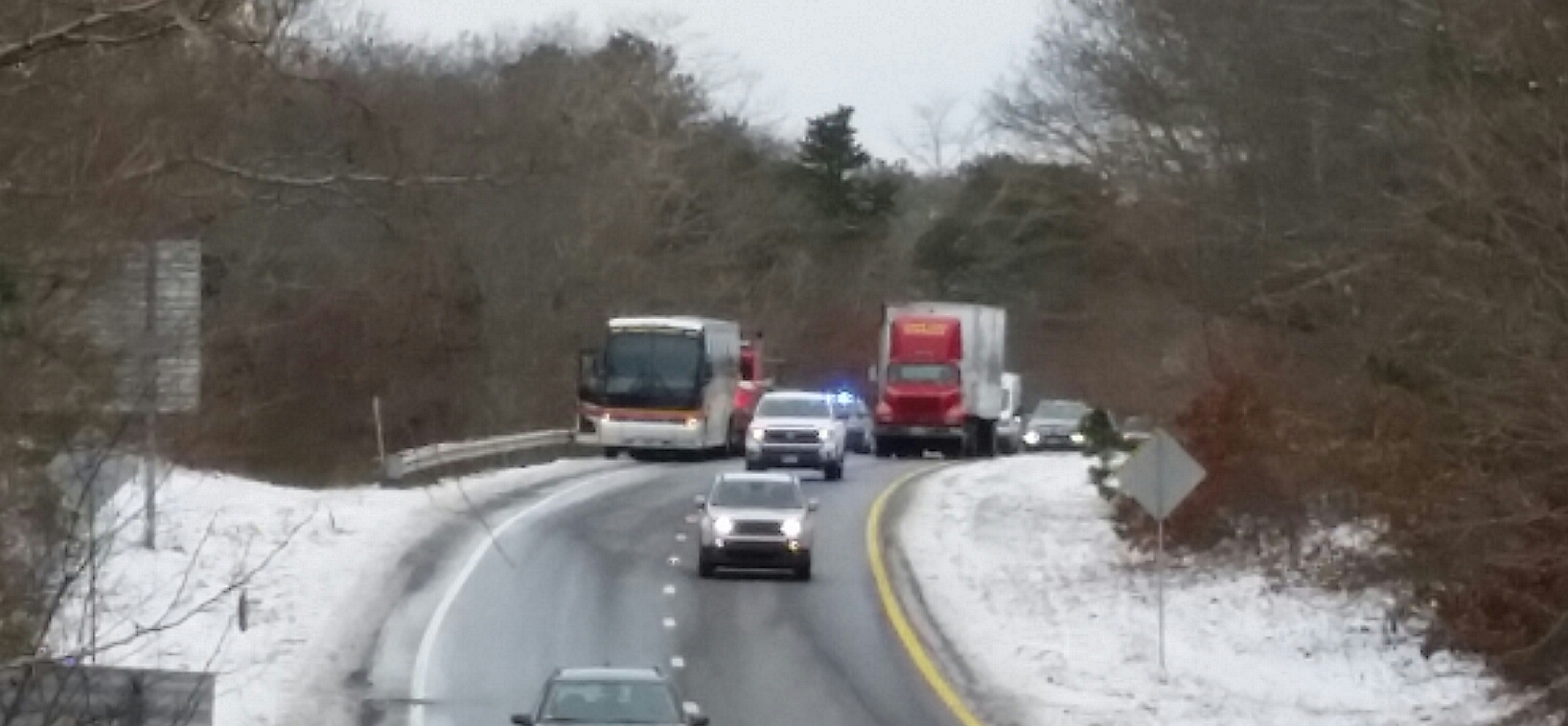 BARNSTABLE – At about 1:00 PM Friday, State Police responded to Route 6 eastbound in Barnstable for a report of a bus fire. It was determined that a Crystal Transport bus was traveling on Route 6 when engine trouble appears to have precipitated one of the tires catching fire. Barnstable Fire responded to put out the fire. The passengers were loaded onto another bus to continue to their destination. There were no injuries.
