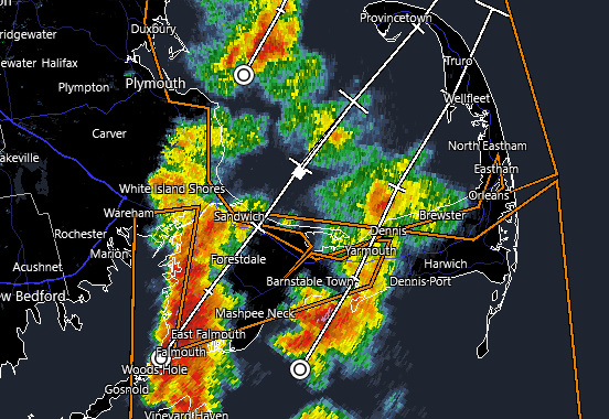 At 752 PM EDT, Doppler radar was tracking strong thunderstorms along a line extending from near Plymouth to 6 miles southeast of Edgartown. Movement was northeast at 30 mph.