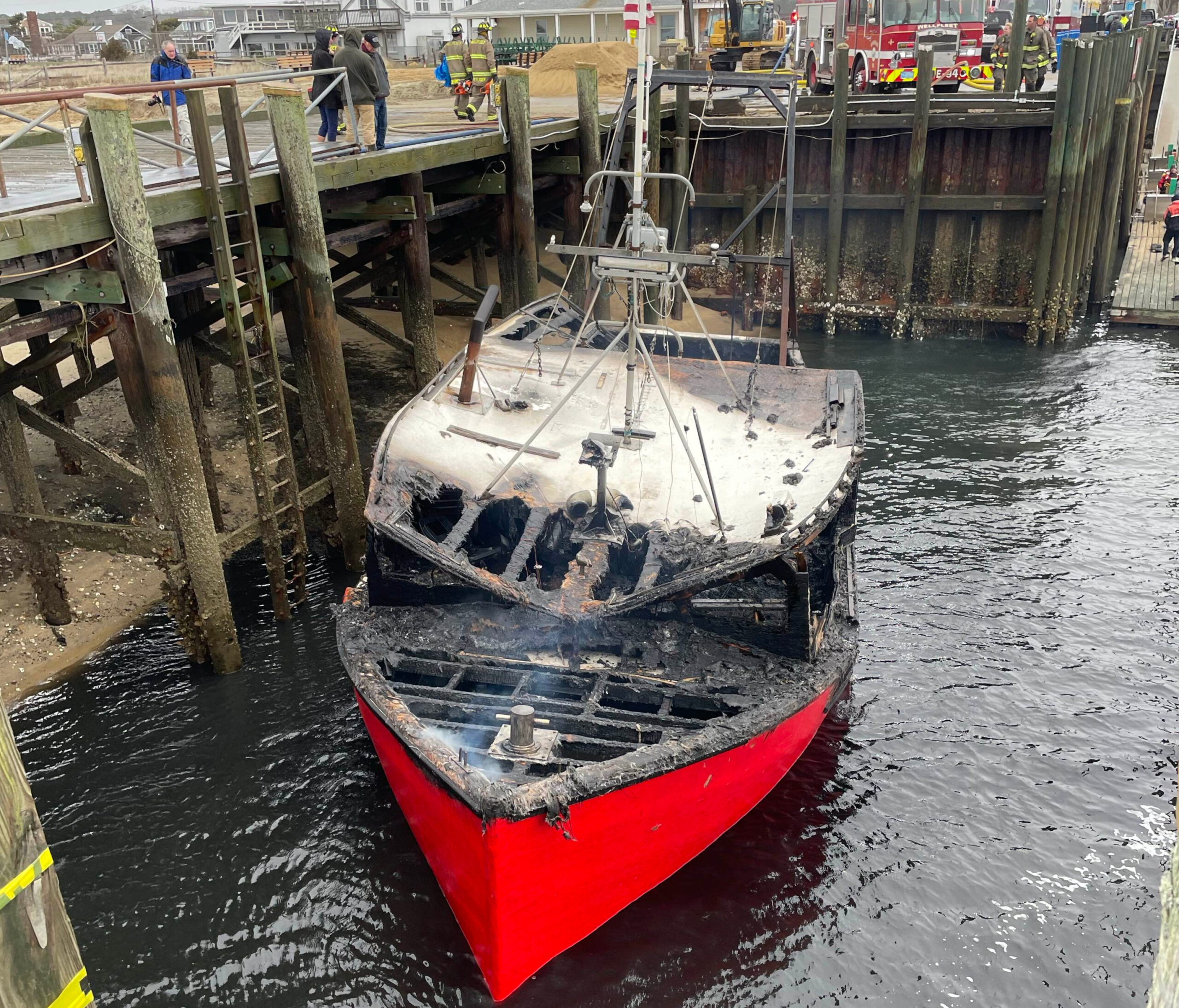 From Wellfleet Fire: At approximately 5:30 AM this morning, the Wellfleet Fire Department received a dispatch to the Wellfleet Marina regarding a fire on a fishing vessel. Upon arrival, firefighters observed that the vessel was fully engulfed in flames, with the adjacent fishing pier also affected. The Wellfleet Harbormaster and the United States Coast Guard were promptly notified.