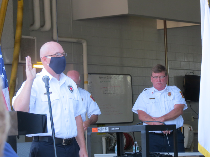 HARWICH – A change of command ceremony was held at Harwich Fire Station #2 Saturday morning. Retiring Chief Norman E. Clarke Jr. officially turned the reins of the department over to Chief David LeBlanc. A badge pinning ceremony was held and then Chief LeBlanc spoke-of course briefly interrupted as a Harwich engine passed the station enroute to an emergency call.