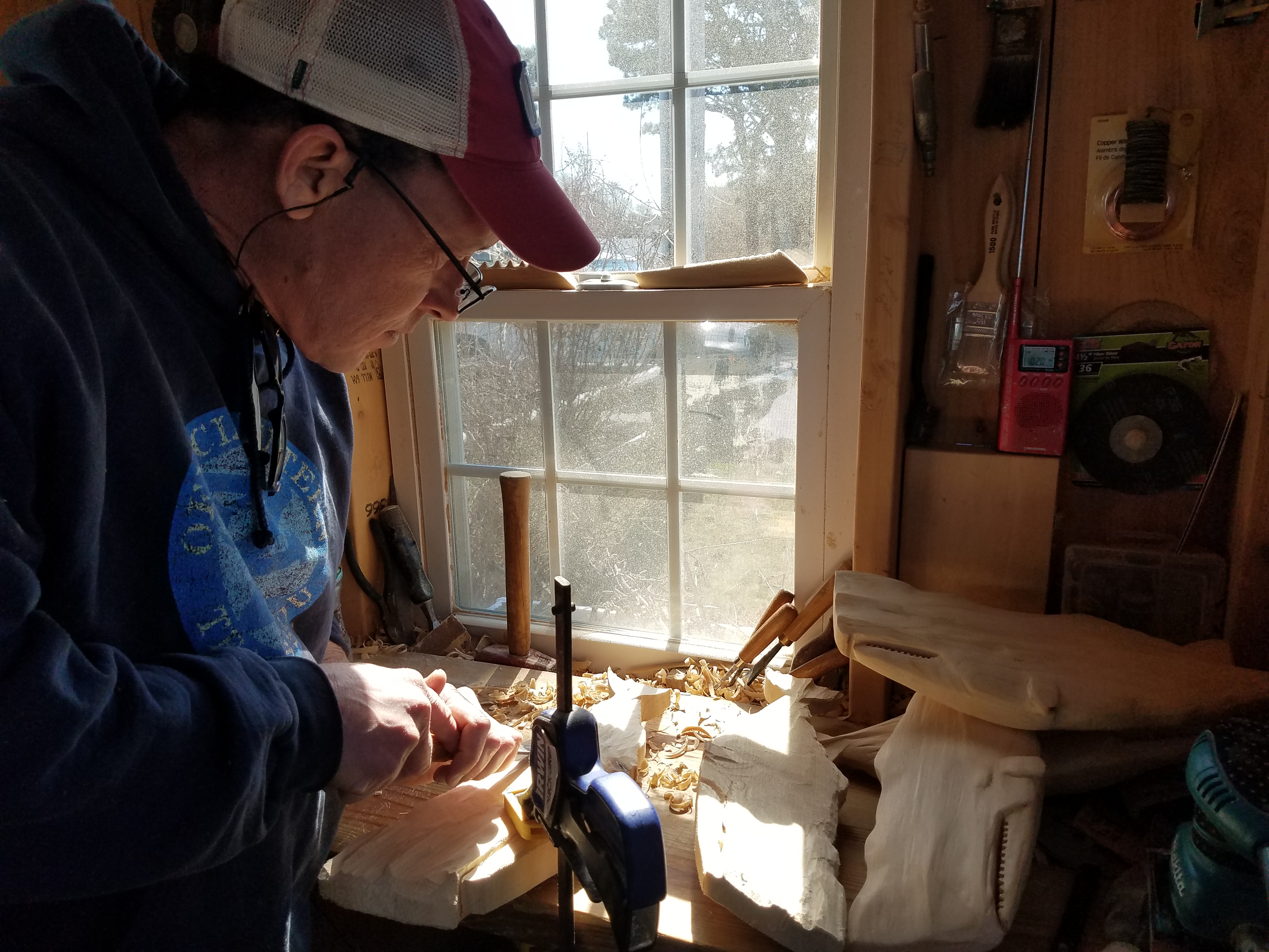 He was surrounded by whales in various degrees of completion and swathes of various types of wood from olive to cherry to pine. He admits that he had to change his work surface to face away from the water to keep focused.