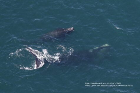 Photo: EgNo 2460 Monarch and 2025 Calf of 2460, photographed in Cape Cod Bay on April 17, 2025 by the Center for Coastal Studies Aerial Survey Team. NOAA Permit 25740-02.