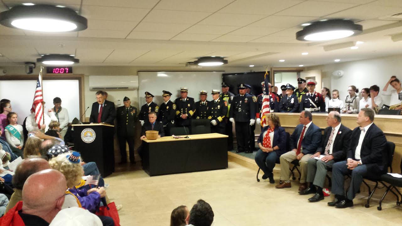 In Mashpee, the town’s ceremony was moved inside town hall from the Veterans Garden at the Mashpee Community Park because of the rain.