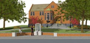 The primary focus of the proposal is to restore the Pioneer Memorial along Main Street and make landscape improvements in front of the library.