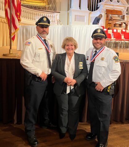 Major Louis Langton, Sheriff Donna Buckley and Major Kevin Fernandes, of the Barnstable County Sheriff’s Office, at Mechanics Hall in Worcester where they received a Medal of Valor on Tuesday, May 2. Courtesy of the Barnstable County Sheriff’s Office.