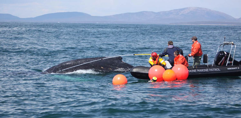 Boaters should never attempt to disentangle a whale as they are large, powerful, wild animals who are often in pain. The whales are unpredictable and can harm bystanders trying to help.