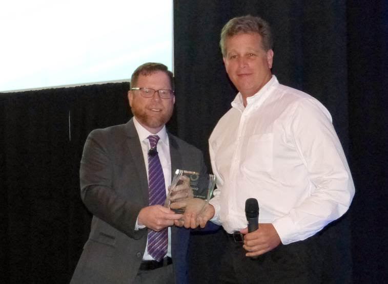 COURTESY OF THE CAPE COD COMMISSION: Mashpee Selectmen Andrew Gottlieb, who also serves as the executive director of the Association to Preserve Cape Cod, right, is presented a OneCape Award last week in Hyannis during the OneCape Summit.