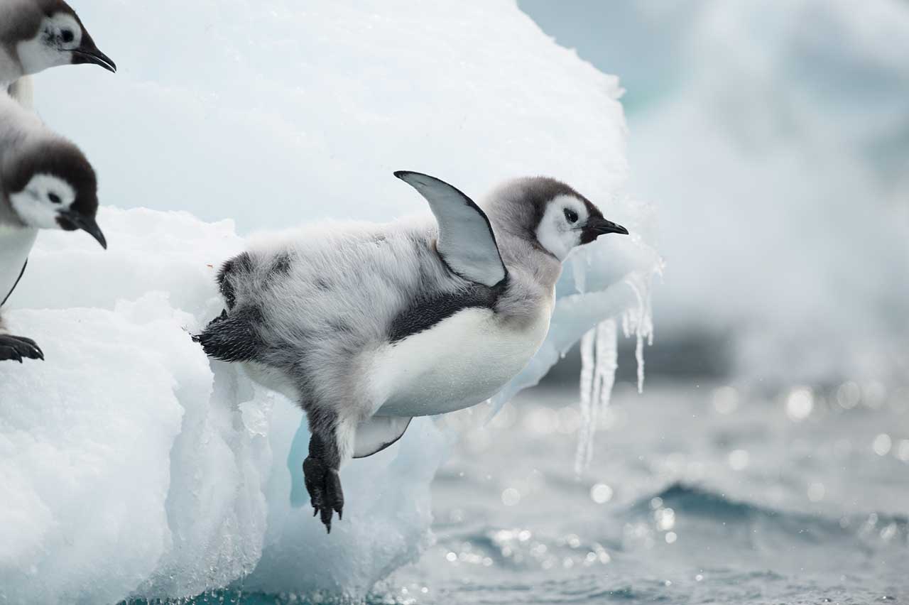 Emperor penguin chicks hatch into one of Earth’s most inhospitable places—the frozen world of Antarctica. Childhood in this environment is harsh and lasts only about five months, when their formerly doting parents leave the fledglings to fend for themselves.