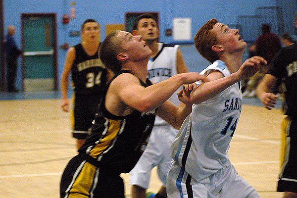 Nauset’s Sam Majewski, shown here battling against Sandwich’s Sam Whittle last Friday night, scored seven points last night to help the Warriors take down the Upper Cape Tech Rams, 78-50.
