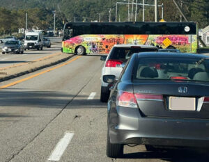 Disabled bus stalls westbound traffic on the Scenic Highway in Bourne
